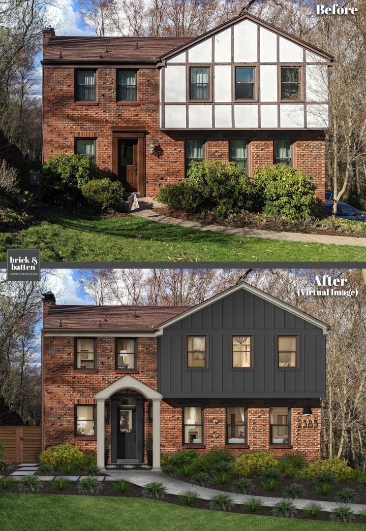 Above is a spectacular. If red or brown brick siding with black window frames isnt quite your cup of tea try giving your homes exterior a dark blue makeover. Large sloping front yard with ornamental grasses and large lawn.